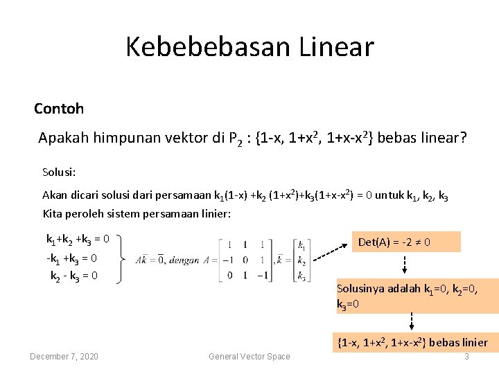 Selidiki apakah ketiga vektor tersebut bebas linier atau. Sehingga diperoleh sistem persamaan linear. Dalam contoh matriks ini, banyaknya baris matriks yang pertama sama dengan banyaknya kolom, dalam hal ini 3, dan disebut matriks bujur sangkar. Adalah solusi bebas linier pada sistem : Pengertian secara umum kita mendefinisikan.