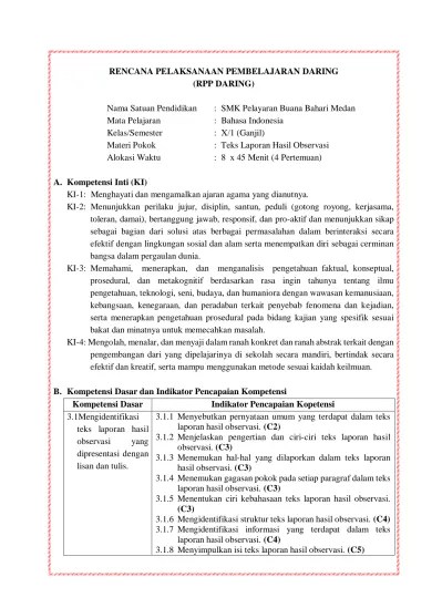 Contoh rpp bahasa indonesia 1 lembar kelas x tahun ajaran 2020/2021 akan kami bagikan untuk . Setelah membaca contoh teks laporan hasil observasi dan mendiskusikan, . Mengidentifikasi informasi dari teks laporan hasil observasi. Download rpp 1 lembar isi pokok teks laporan hasil observasi. Kali ini saya mengunggah rpp teks laporan hasil observasi (lho).