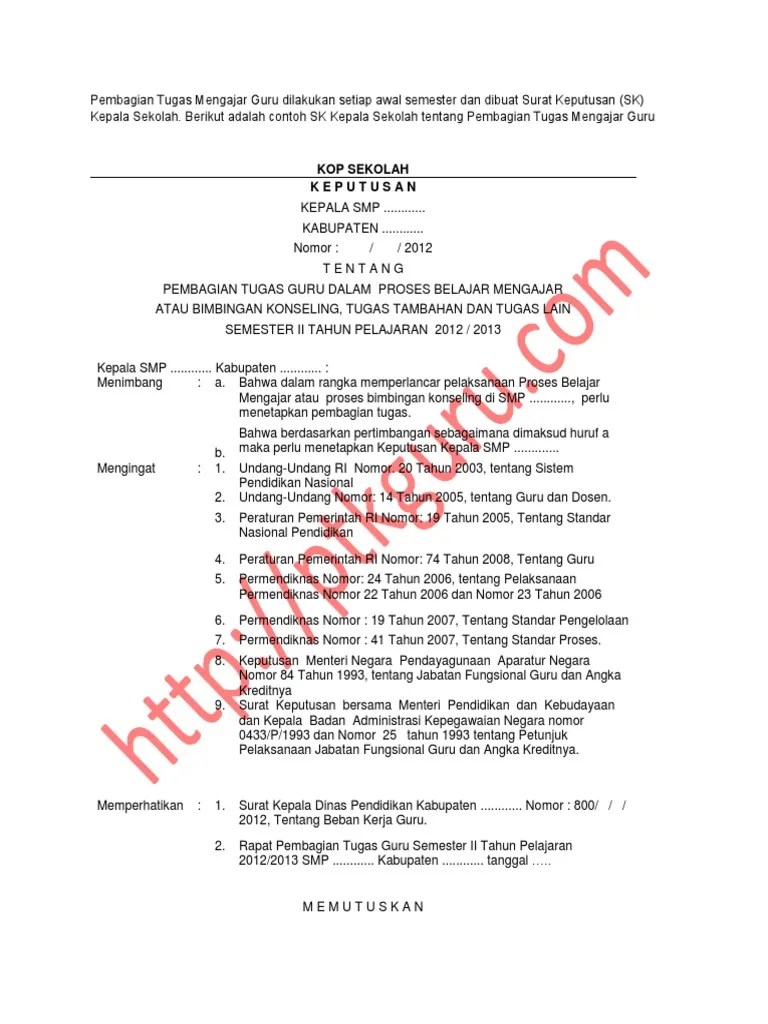 Sk ptm berisi beban mengajar guru di sekolah serta tugas tambahan lainnya, seperti membina kegiatan ekstrakurikuler, membimbing pembiasaan, . Surat keputusan pembagian tugas guru dalam mengajar tersebut dapat dibagi menjadi tiap semester atau juga dapat disusun dalam 1 tahun 2 . Pembagian tugas mengajar guru dalam proses belajar belajar mengajar tahun pelajaran 2020/2021 semester i seperti tercantum dalam lampiran 2 keputusan ini. Awal tahun pelajaran 2020/2021 dimulai tanggal 13 juli 2020. Berikut kami bagikan contoh sk pembagian tugas guru dalam kegiatan belajar mengajar, tugas tambahan, ekstra kurikuler dan ko kurikuler tahun .